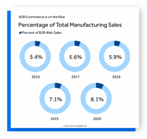 According to research by Digital Commerce 360, B2B ecommerce now accounts for 8.1% of total manufacturing sales, increasing individual market share by 50% since 2016.
