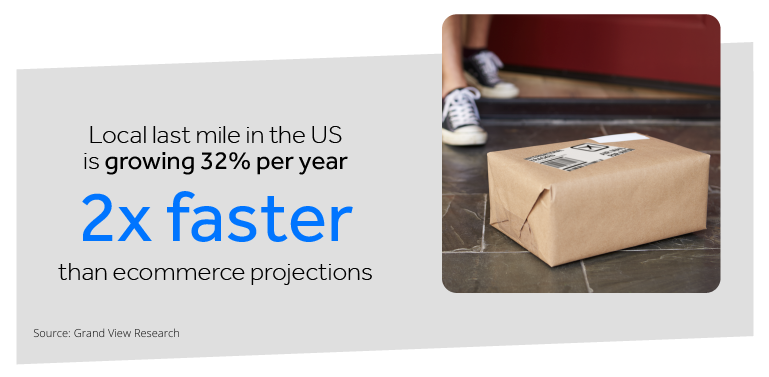 Enter same-day delivery. Much like the rise of buy online, pickup in-store (BOPIS) and curbside pickup, same-day delivery is surging. In fact, the market for local last mile in the US is growing 32% per year according to Grand View Research – two times faster than ecommerce projections – as same-day deliveries become the standard.