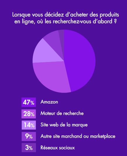 Les acheteurs français sont plus nombreux à rechercher d’abord leurs produits sur Amazon (47 %) que sur les moteurs de recherche (28 %). On constate une forte prévalence d’Amazon comme première destination d’achat. C’est une tendance qui croît depuis plusieurs années : beaucoup d’acheteurs utilisent le moteur de recherche d’Amazon directement, sans passer par un moteur de recherche classique. Conclusion : les e-commerçants ont donc tout intérêt à être bien référencés sur les marketplaces telles que Amazon.
