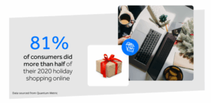 According to a Quantum Metric survey on 2021 holiday shopping behaviors, 81% of respondents did more than half of their 2020 holiday shopping online and plan to purchase the same amount, if not more, of their gifts online during the upcoming holiday season. Two in three (62%) consumers plan to spend more than they had before the pandemic due to being able to see family this year.