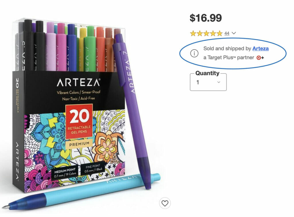 The goal with Target Plus is to seamlessly integrate third-party products with Target’s internally hosted items. Since Target Plus items are held to the same product and shipping standards as items sold directly by Target, the qualities that distinguish a merchant’s listing from one of Target’s own are subtle. In the image shown below, you will see where the circled section shows the merchant details for this Target Plus item: