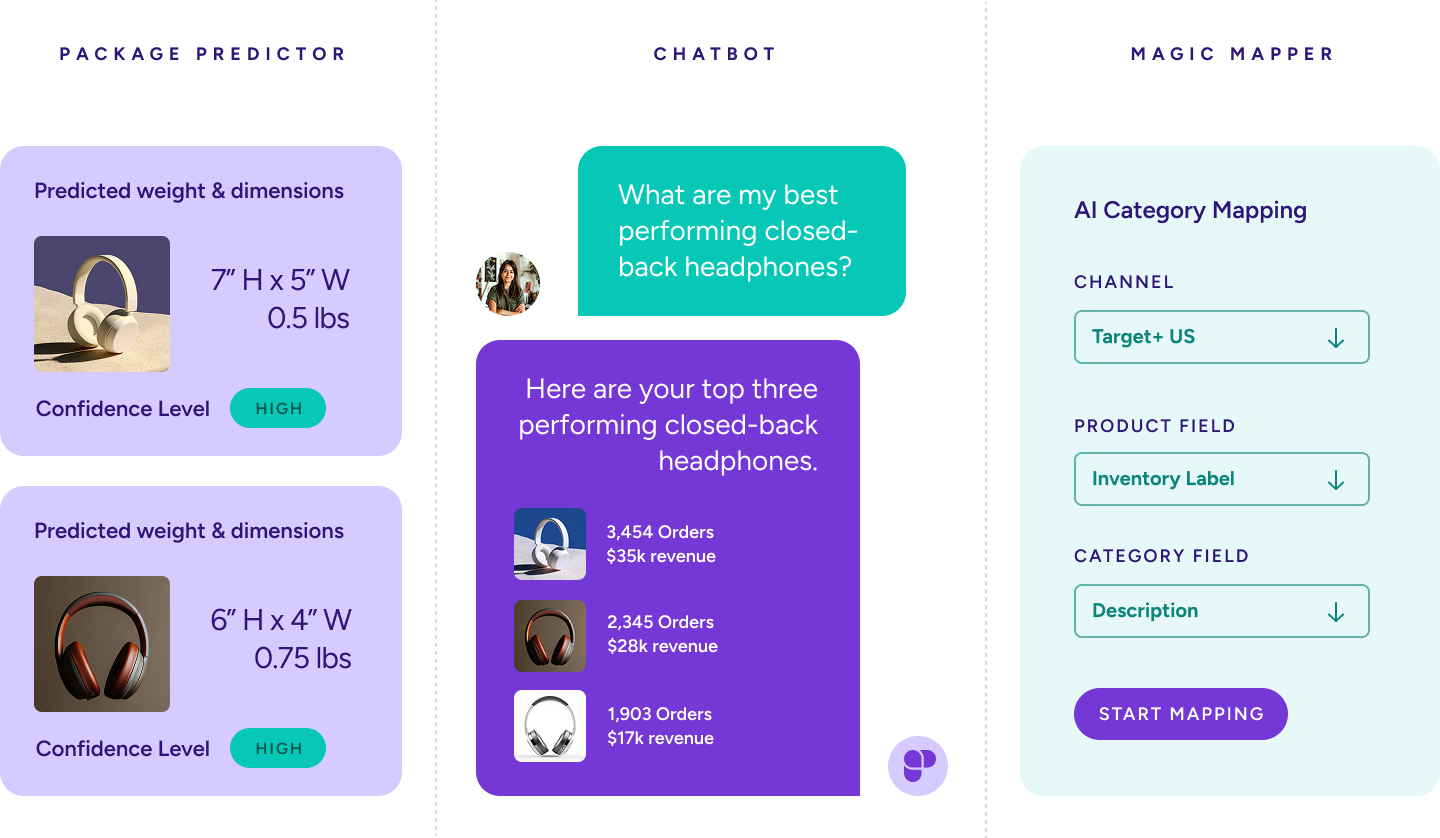 Make better decisions in less time with AI-driven tools like our Package Predictor, Magic Mapper, and Chatbot for Retailers, cutting down manual work and helping you operate at the speed of modern commerce.