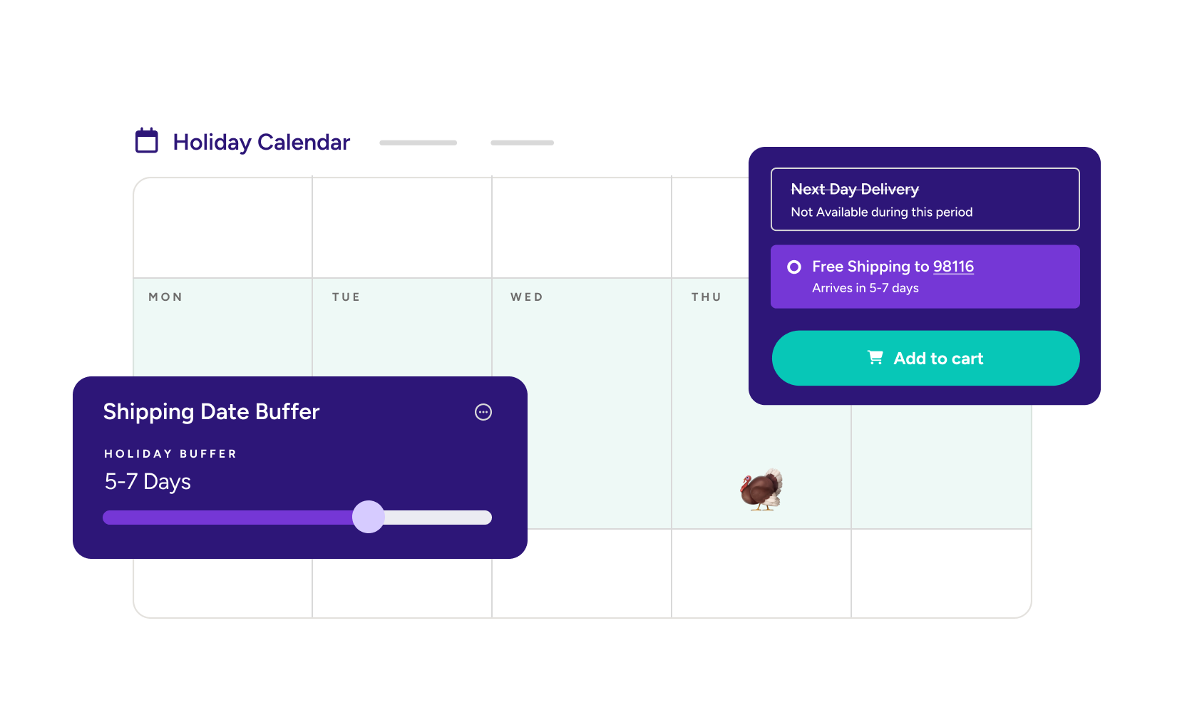 Processing and transit time buffers help you adjust for seasonal peaks, special handling, and more. These buffers can be applied at the order level or more broadly, giving you flexibility without sacrificing accuracy.
